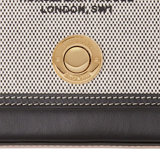 Hampshire crossbody bag from Burberry in topstitched leather and canvas, detailed with the brand's Horseferry print logo. The bag has an adjustable & detachable leather shoulder strap, concealed slip pocket at the front, internal zip pocket & card slots with gold-toned branded hardware. Wear on the shoulder, across the body or carry as a clutch.