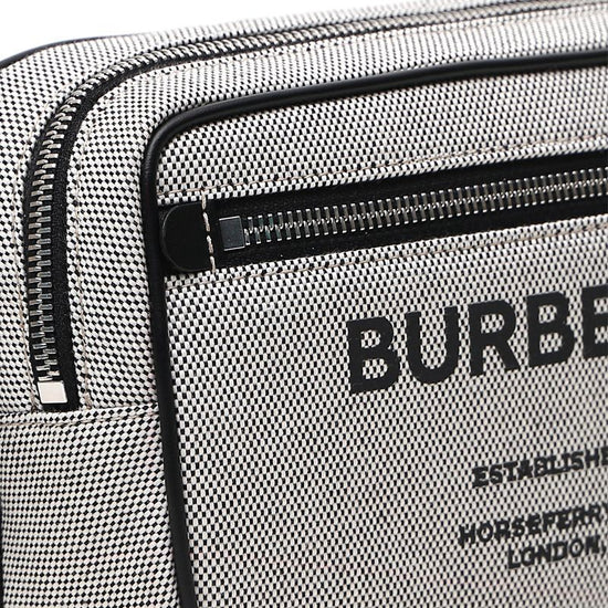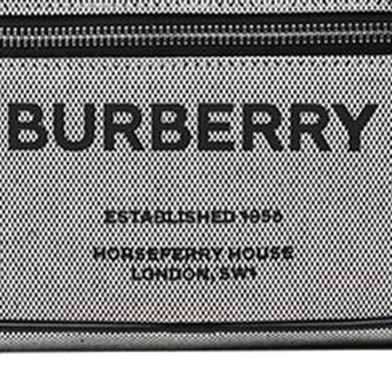Belt bag from Burberry in topstitched leather and cotton canvas, detailed with the brand's Horseferry print logo. The bag has an adjustable belt strap with branded metallic fastening, front zip pocket and a zipped main compartment.