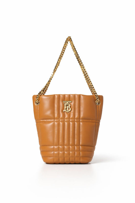 A softly structured quilted runway bag by Burberry crafted from Italian-tanned lambskin. The compact style is punctuated with a polished chain strap and the Thomas Burberry Monogram. The bucket bag features a chain shoulder strap, three card slots, concealed magnetic closure, hand-painted edges & polished metal hardware.