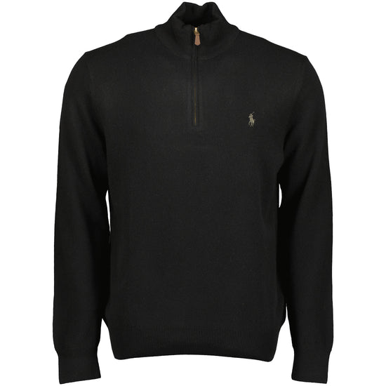Funnel neck jumper by Ralph Lauren knitted in 100% merino wool. The knit features quarter zip closure, ribbed trims and the signature polo pony logo embroidered to the chest.