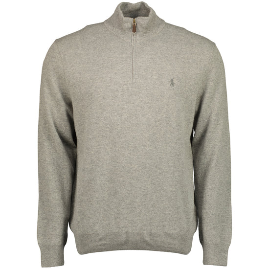 Funnel neck jumper by Ralph Lauren knitted in 100% merino wool. The knit features quarter zip closure, ribbed trims and the signature polo pony logo embroidered to the chest.