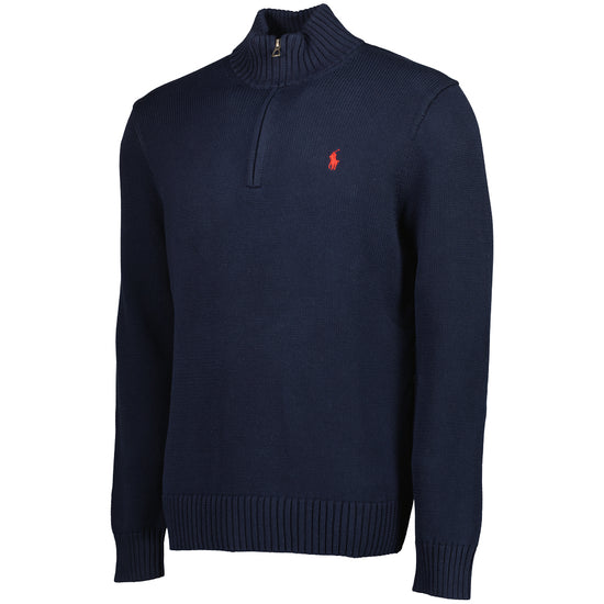 Mesh-knit pullover by Ralph Lauren crafted from 100% cotton. The knit features a pique exterior, quarter zip closure, ribbed trims and the signature polo pony logo embroidered to the chest.