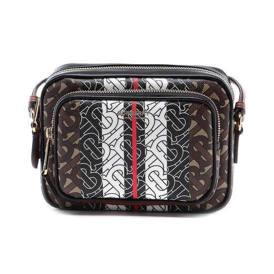 Camera bag by Burberry with a TB monogram stripe design crafted in coated canvas & leather trim. The bag has an adjustable leather strap, a large main compartment with internal zip and slip pockets, additional zipped front compartment, gold-tone branded hardware & a small logo print at the front.
