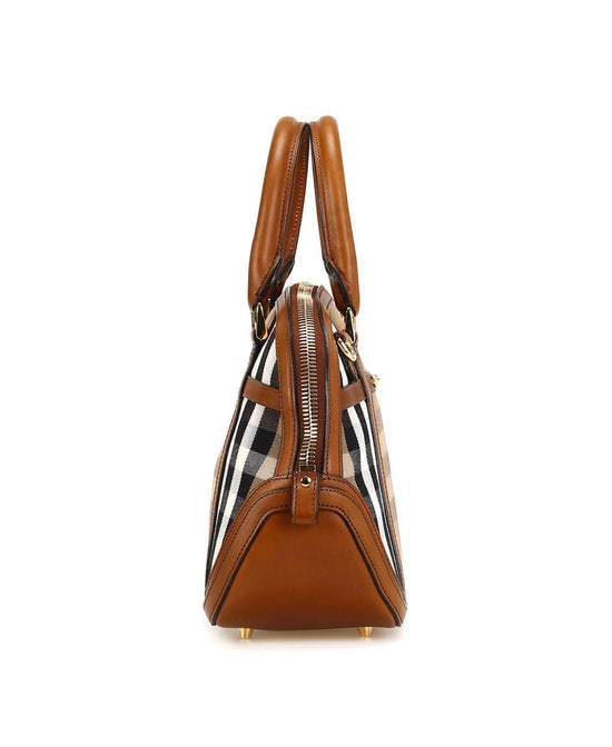 Fabric bowling bag in a classic Burberry check design with leather and gold-toned metallic details, double tubular leather handles, removable and adjustable leather shoulder strap attached with metallic hooks, gold-toned metallic logo label on the front, strengthened leather bottom with protective gold-toned metallic feet. Internal cotton lining, zipped pocket and two open pockets with leather trims & a leather logo label.