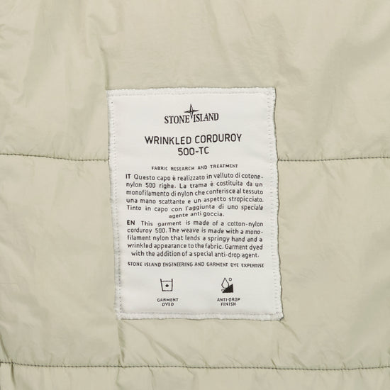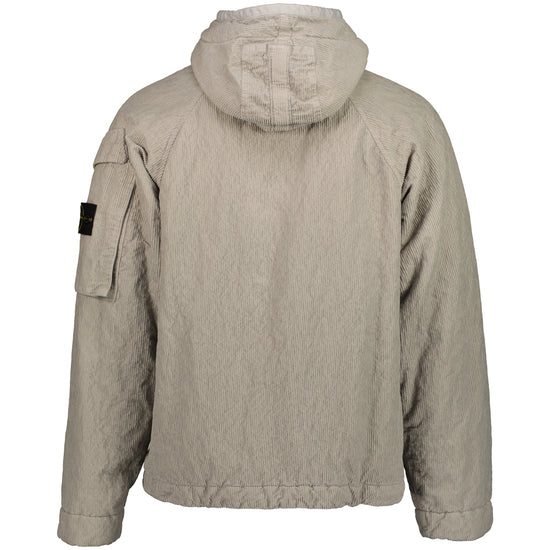 Hooded jacket by Stone Island in cotton-nylon corduroy. The jacket features a padded internal layer, full two-way zip fastening with concealing placket, zipped hand pockets, adjustable cuffs & a bellow pocket to the left sleeve housing the signature removable compass logo patch.